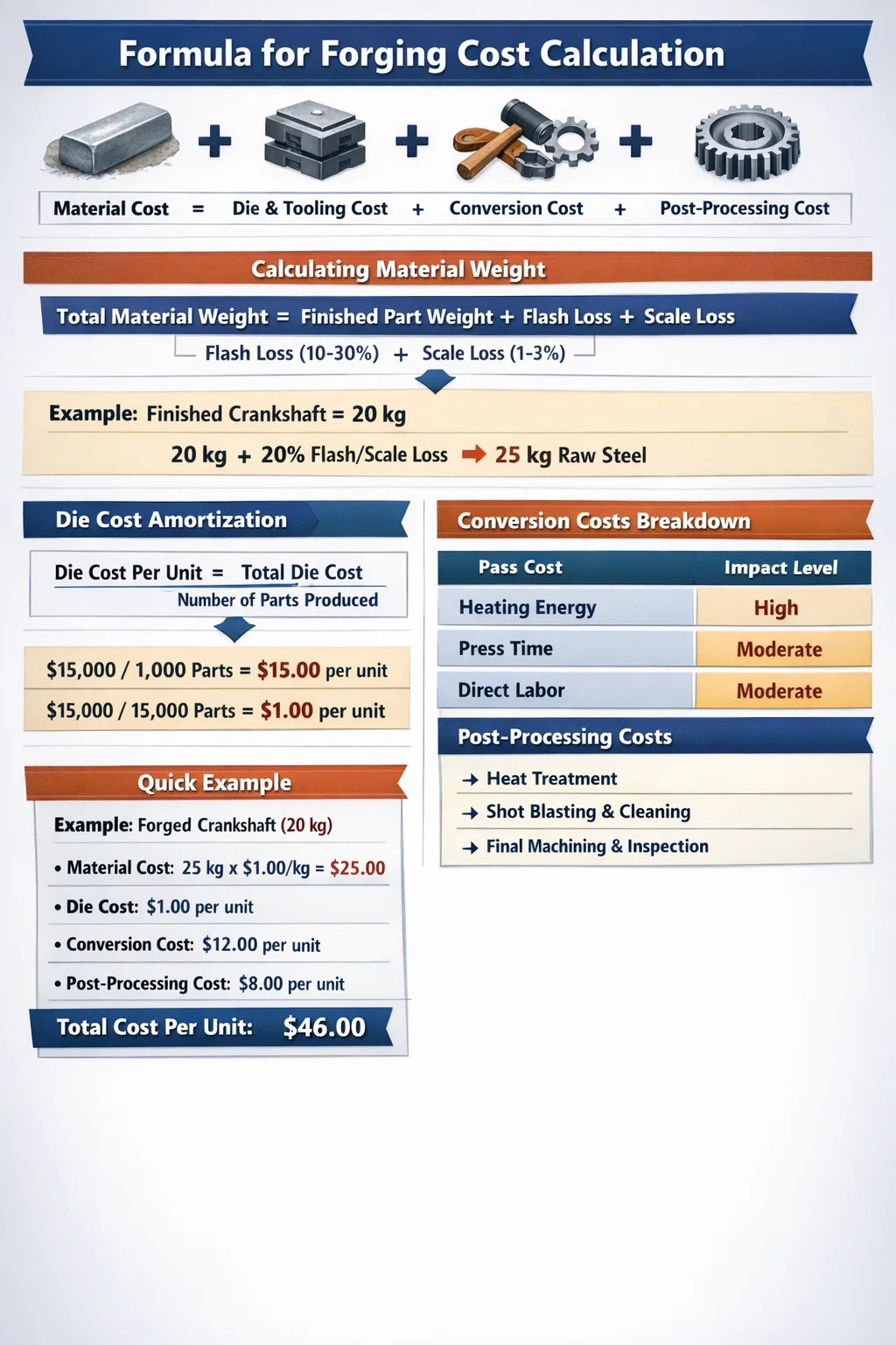 Nu toate kilogramele sunt create egale. Un simplu disc rotund este mult mai ieftin de forjat decât o carcasă cu pereți subțiri cu cavități adânci. Piesele cu complexitate ridicată necesită mai multe „lovituri” de la ciocan, uzură mai mare a matriței și tăiere mai frecventă, toate acestea crescând costul de conversie. La estimare, inginerii aplică adesea a Multiplicator de complexitate (1,0 până la 2,5) la rata de conversie de bază pentru a răspunde acestor provocări.
